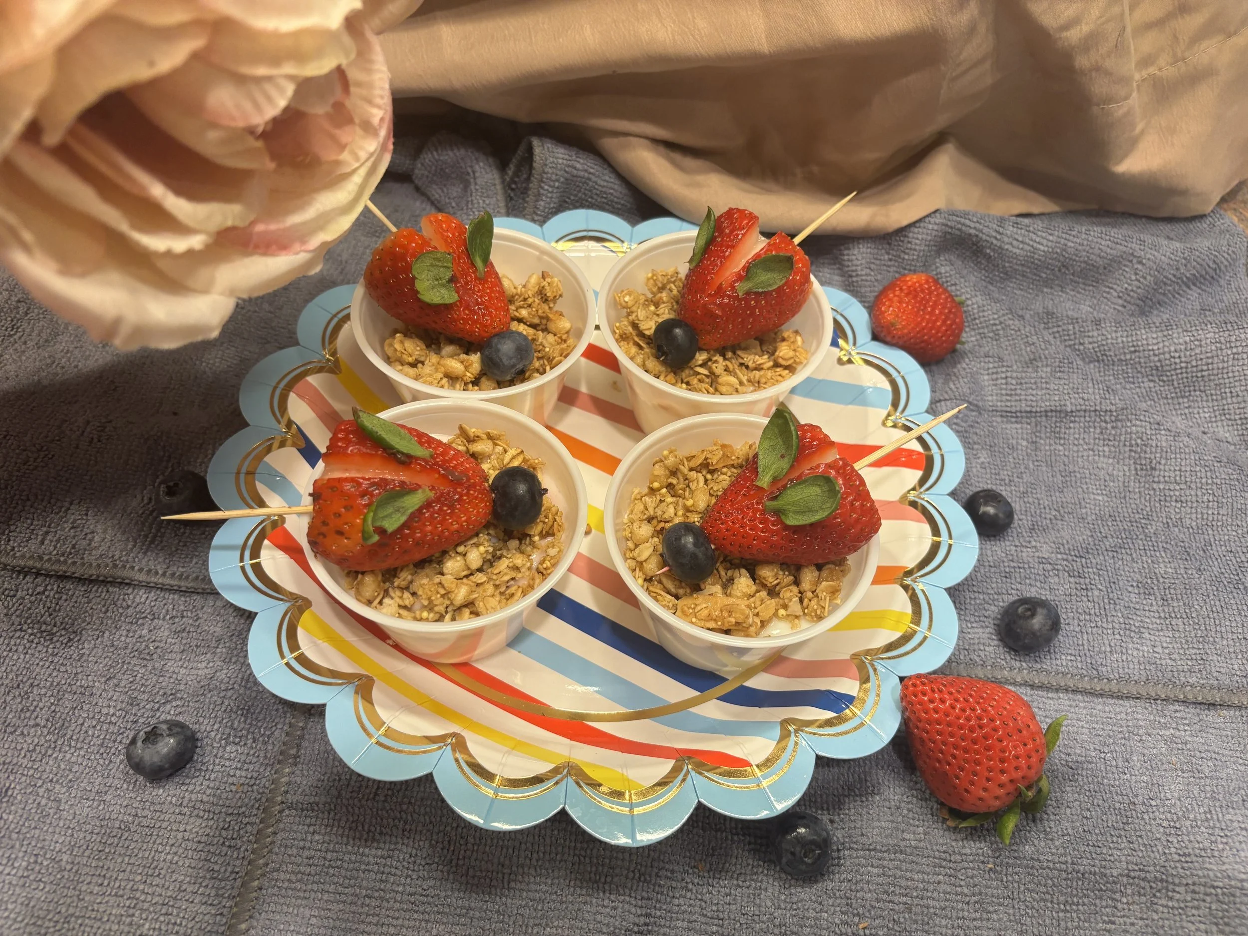 Place your newly constructed strawberry mouse on top of the granola and dip!